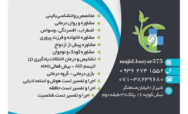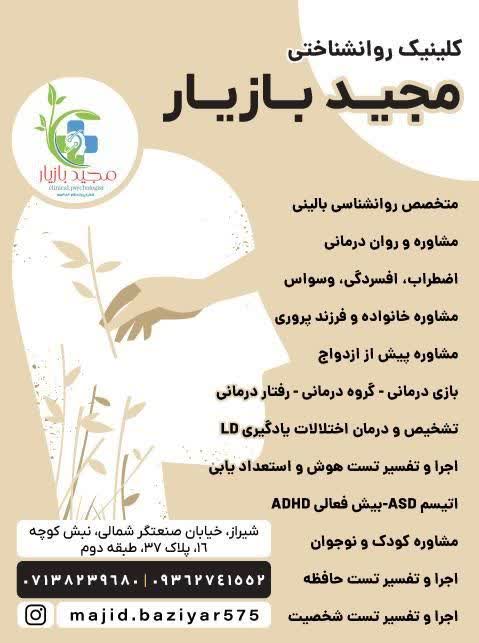 کلینیک روانشناختی مجید بازیار دارای پروانه فعالیت از نظام روانشناسی با کادری مجرب و سابقه ۱۵ سال خدمات تخصصی روانشناسی و مشاوره به مراجعین گرامی در شهر شیراز می باشد.